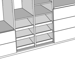 How is it different from standard CabWriter tools? CabWriter Pro and Home are designed to draw cabinets, defined as being a box or carcass, with or without end panels or sheets, with a face frame or frameless, and usually including doors and drawers. Any number of boxes are connected together to form a run of cabinets, sometimes with a face frame that spans multiple boxes. This works great for kitchens, bathroom vanities, media centers, and many other applications. Closets on the other hand, often consist of a number of discrete parts such as ends, partitions, tops, bottoms, fixed and adjustable shelves (including slanted), doors, drawers, and often a collection of cleats and stretchers for mounting hardware, sometimes with a cabinet or two mixed in. In many instances, there are no backs to the closets, which is another big difference from cabinets. Most of the time, these parts are assembled onsite due to the tight confines of the space. CabWriter Closet is optimized to draw all of these individual components which the user can then group into discrete closet modules for documentation purposes.