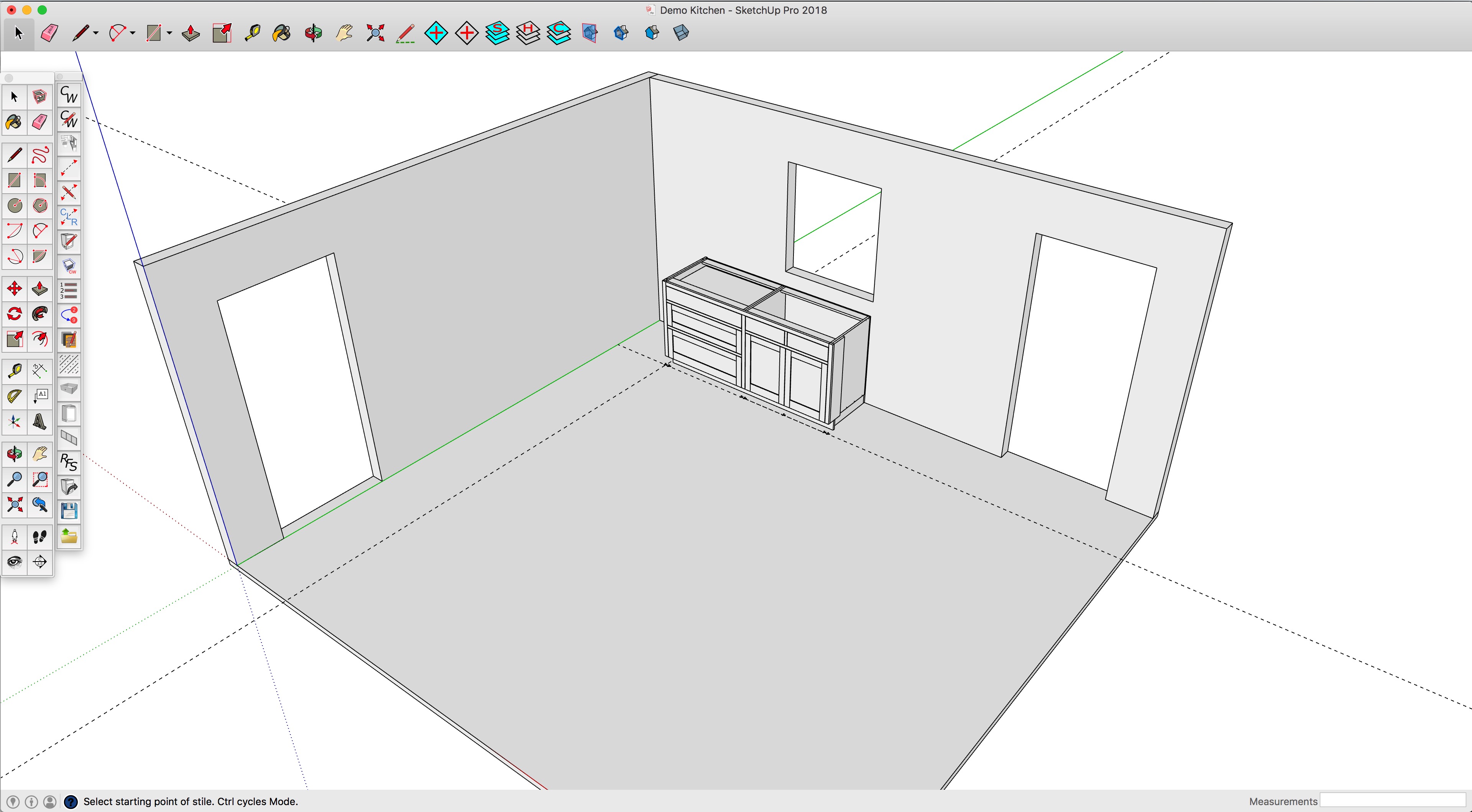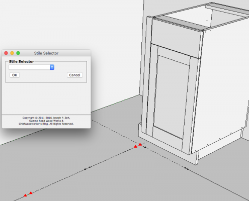 Start laying out the cabinets by using Sketchup’s tape measure tool to draw lines 24″ out from the walls for the base cabinets. Marks are also made to indicate the center of the window which determines the placement of the sink base cabinet. The Story Stick tool is first used to indicate where the end markers of the cabinet are, and just as importantly, what type of end it is, which in turn determines things like whether to draw a side panel or whether to add a scribe allowance to a stile that abuts a wall in the case of a face frame design. In this case, we’re placing a right end because it’s going to be next to the dish washer opening.