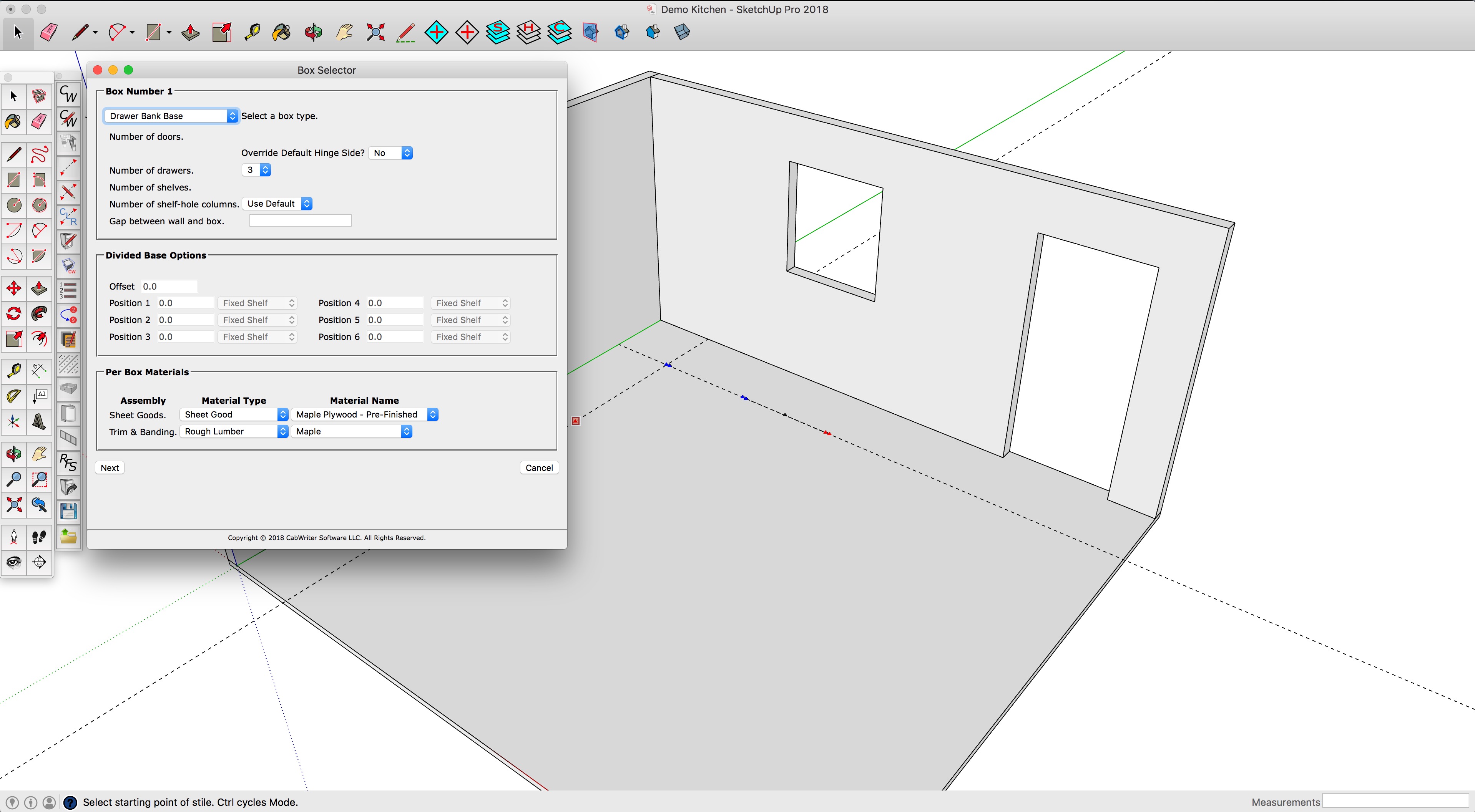 Lastly, we specify the type of cabinet we want for each of the cabinet boxes we specified using the Story Stick tool. CabWriter highlights in blue the active cabinet. In this case, we want the left box to be a drawer bank with three drawers. You can also choose the number of drawers or override the material specification for the carcasses at this point as well as change other options.
